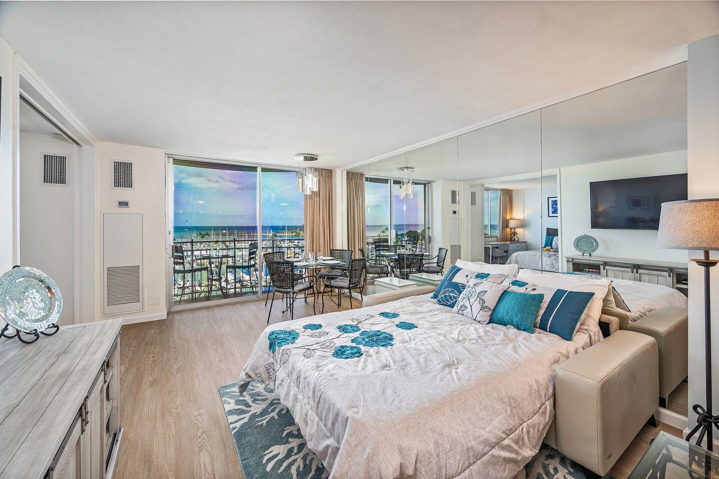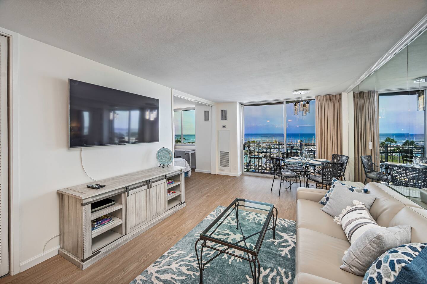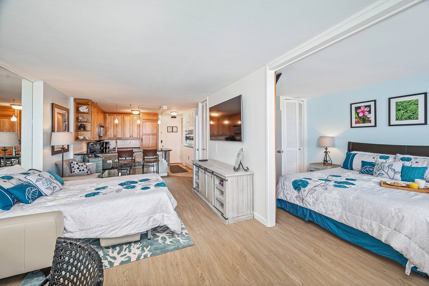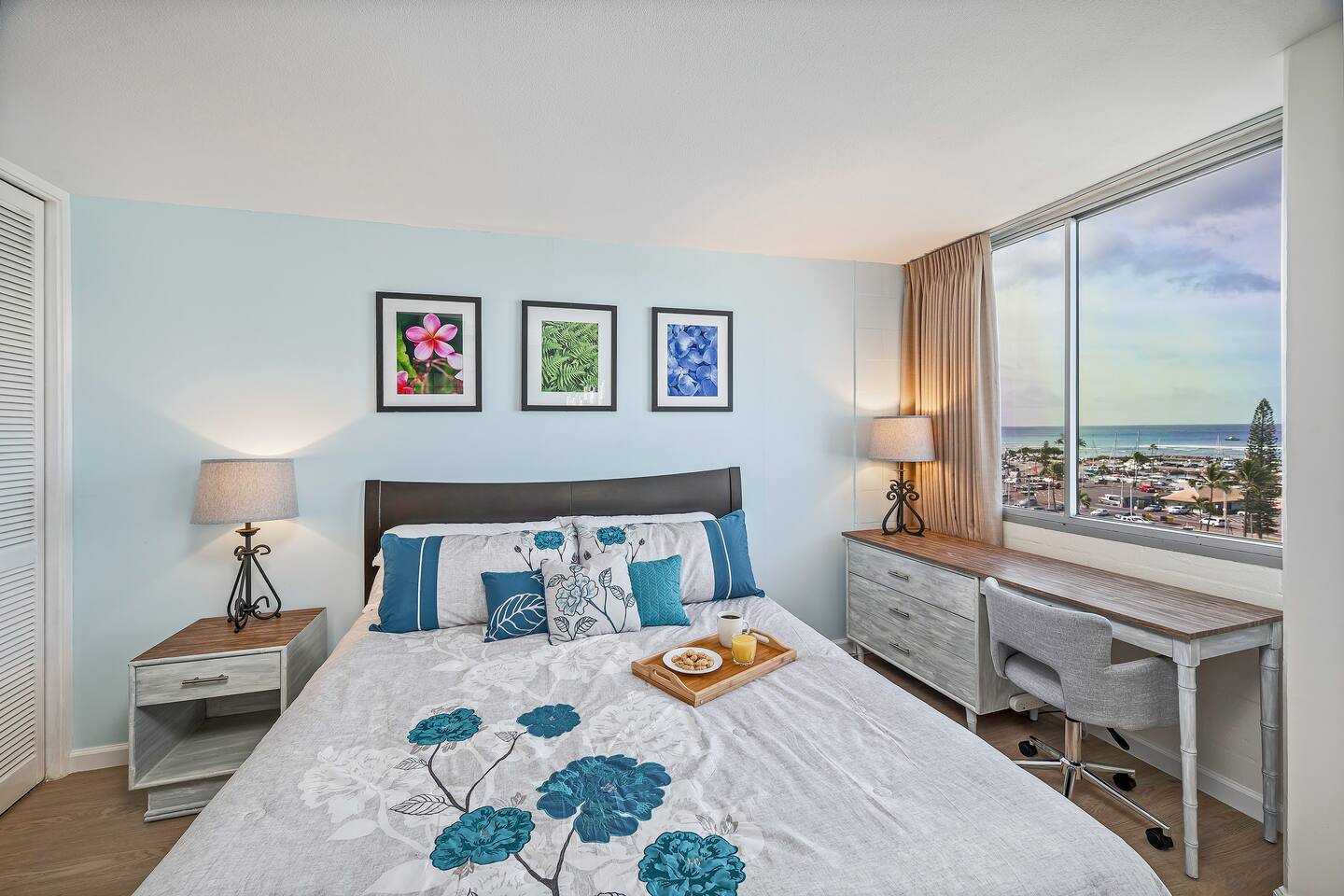 We’re happy to share that the lanai (balcony) for this unit is now open and ready for you to enjoy ocean breezes and island vibes. Please note that the building is continuing construction work in other areas (primarily on the mountain side). From time to time, you may hear construction noise — including jackhammering — Monday through Friday between 8:00 AM and 4:00 PM. The work does not occur in the evenings or on weekends, and while noise is not constant, it may be noticeable during parts of the day. This spacious condo was thoughtfully designed for comfort and enjoyment of downtown Waikiki living. Guests will enjoy a large master bedroom with California King bed, built in desk space, adjoining full bathroom, large kitchen with cooking essentials, and seating for 4 at the dining table, comfortable seating area with queen size memory foam sleeper sofa and large flat screen TV, cable and high speed internet. This condo includes everything needed for a home away from home. Beach gear is included with beach towel, snorkel gear, chairs, umbrella, and boogie boards. Perfect for a short walk to Hilton Lagoon across the street, or Ala Moana Beach park. Lots of great, local food nearby with the iconic Chart House located in the building. Short walking distance to Waikiki beach, or stroll down the to the famous shopping strip!